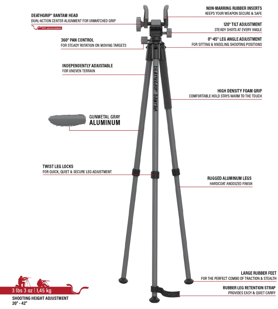Don’t think it’s possible to have game-changing stability in a lightweight tripod? The DeathGrip® Bantam would like to have a word. Featuring the world-renowned dependability of its big brother the original BOG® DeathGrip® tripod, the DeathGrip® Bantam is designed for situations where a more compact, lightweight tripod is needed. Weighing in at just over 3 lbs, the DeathGrip® Bantam is up to 44% lighter than the competition, putting it in a weight class all its own. Featuring sitting to kneeling shooting, a maximum holding weight of 40 lbs, and a price tag up to 50% less than the competition, the DeathGrip® Bantam is a tripod that punches above its weight class!