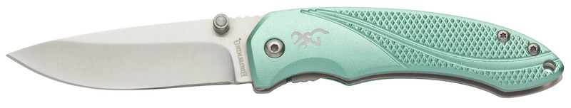 Liner lock folding knife with stainless steel drop point blade. Anodized mint green aluminum alloy scales with checkered texture. Thumb stud with pearl look inlay.