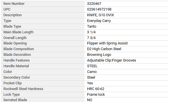 - Black G-10 handle scales with aluminum bolster coated with Browning OVIX™ camo pattern