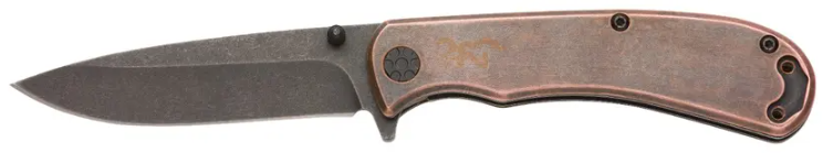 - Copper handle scales with engraved Buckmark or black canvas laminate handle scales with brass-colored inlay and fasteners