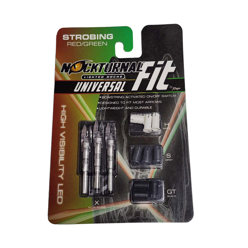 Strobing FIT Nock: Designed to fit nearly every hunting arrow on the market the Nockturnal Fit strobing base nock will fit X-diameter arrows, and each three-pack of Fit nocks includes three sets of Nock Collar adapter sleeves to fit GT, S and H arrows. Each Fit nock features ultra-strong, impact resistant, clear polycarbonate nock construction encapsulating two brilliant LED lights that alternate after engagement by the patented string-activated, piston-driven linear contact switch. Like all Nockturnal nocks, the strobing Fit nock is guaranteed to reliably activate immediately when the string is released, and it can be switched off quickly and easily with the Nockturnal Nock Tool, a small screwdriver or most broadhead tips via an opening in the side of the nock. With well in excess of 20 hours of lithium battery life, each strobing Nockturnal Fit weights approximately 25 grains and will remain brightly lit and strobing for plenty of time for arrow retrieval and can be easily spotted in daylight or darkness. The strobing version alternates 400 times a minute between the Red/Green, Red/Blue and Green/Blue.