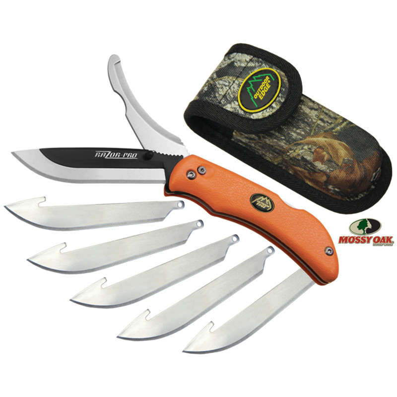 Replacement packs of 6 blades are sold separately. Rubberized TPR handles are available in black with a black nylon sheath and blaze-orange with Mossy Oak® camo sheath.
