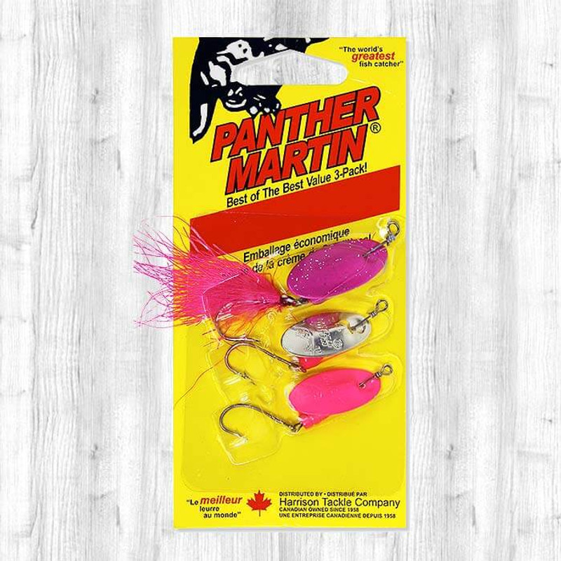 Panther Martin Pink Lure Kits 3 pack have a unique blade pattern and genuine silver and gold plating which produces the most flash and reflection of any Panther Martin spinner ever!