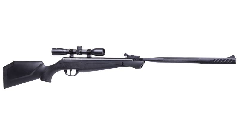 The Crosman® Shockwave .177 break barrel air rifle boasts a lighter and smoother cocking force than others in its class. With Nitro Piston technology, the Shockwave has reduced recoil and shoots with 70% less noise. This rifle features a durable all-weather synthetic stock and foregrip, rifled steel barrel, two-stage adjustable trigger, and 4x32mm scope. The Shockwave generates velocities up to 1200 fps and delivers power and accuracy in a contemporary package.